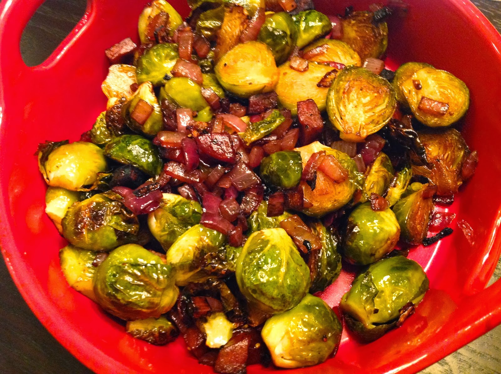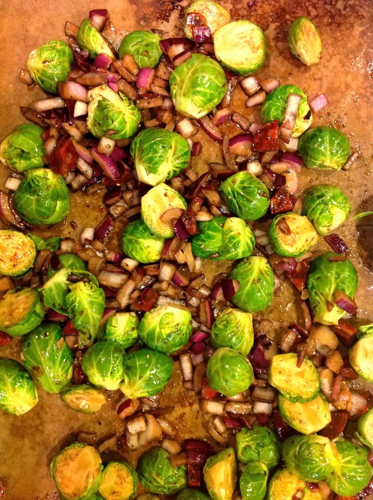 Balsamic Vinegar Roasted Brussels Sprouts with Chorizo and Red Onion