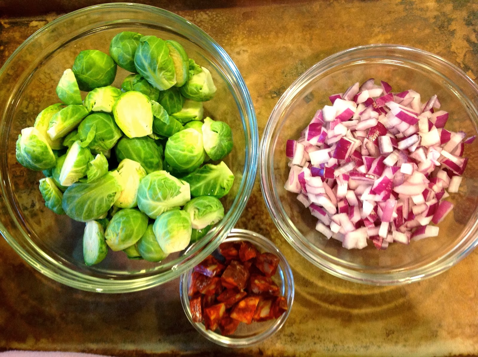 This is by far the simplest recipe I’ve shared on this blog. It is so simple that it barely has measurements and it only has 5 ingredients! This recipe was created out of pure hunger. One day last week, I was super hungry and the refrigerator was nearly bare. So, after rummaging through the kitchen, I found some Brussels sprouts and a small hunk of almost-forgotten-about Spanish chorizo. I threw in some chopped red onion and a drizzle of olive oil and balsamic vinegar, and voila! an easy and delicious side dish! If you have some Spanish chorizo on-hand, definitely give it a try. I say “Spanish chorizo” because it is a completely different product than the Mexican fresh chorizo that you typically find in the grocery store. Spanish chorizo is cured and has a firm texture, like aged salami. The chorizo, while completely optional, brings a little bit of heat to the dish and it really does have an amazing flavor. The balsamic vinegar heightens the caramelization of the Brussels sprouts and gives it a wonderful sweetness. I’m proud to say that I have converted quite a few Brussels Sprouts Haters to fans, so I hope you’ll give them a try even if you thought you hated them before!