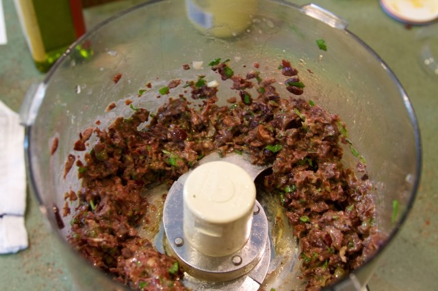 1. In a food processor, combine the olives, anchovy paste, capers, and garlic and pulse three or four times.