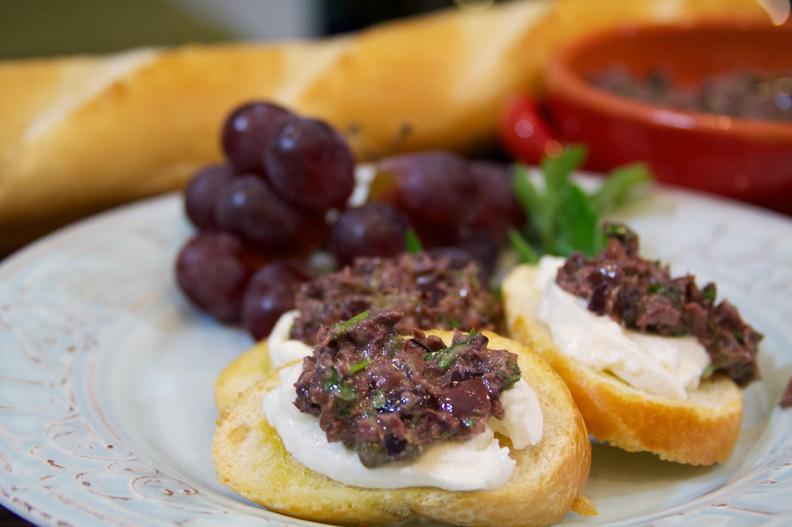 4. After the bread has toasted (spread each crostini with a bit of the cheese and then top with a spoonful of the tapenade.