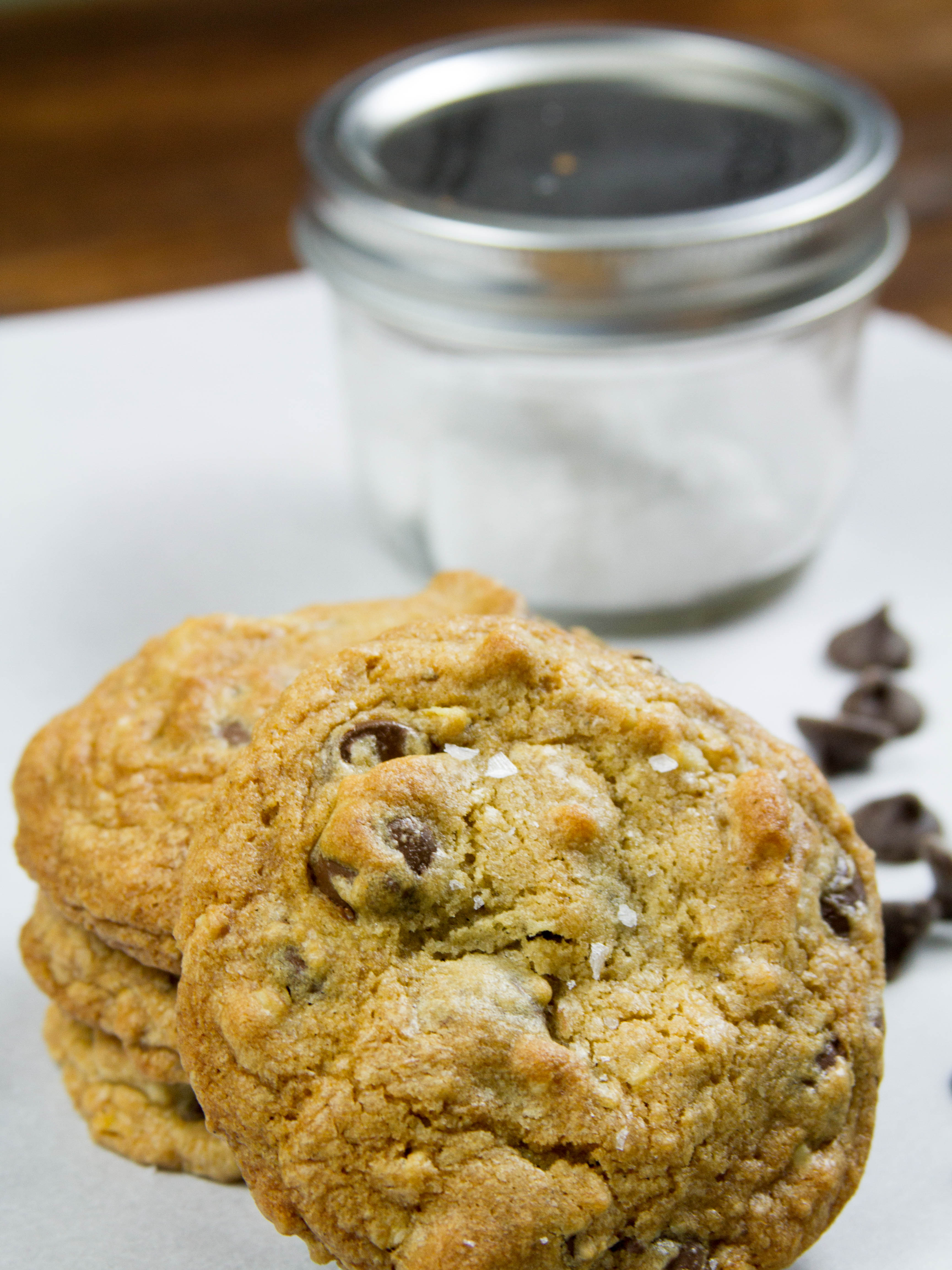 5. Line a baking sheet with parchment paper.  Use an ice cream scoop to portion 12 cookies and place on the sheet.  Sprinkle each cookie with a few grains of the sea salt and bake.  The original recipe calls for baking these cookies for 8 to 10 minutes, however, I chose to bake mine for 14 minutes and they were perfect–golden brown and puffed in the middle and crisp around the edges.  When they are done, transfer the cookies to a rack and allow them to cool just a bit. Then dig in, because to me there is nothing better than a cookie warm from the oven!