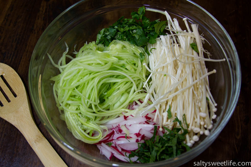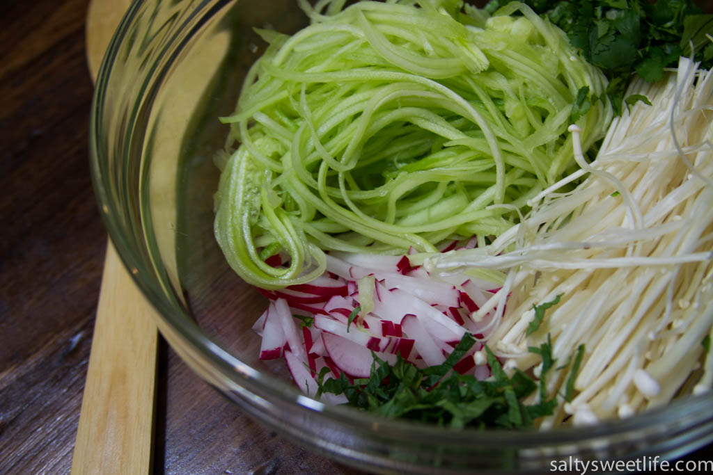 1. Thinly slice or julienne the cucumbers and the radishes and add them to a medium sized bowl. Rinse the Enoki mushrooms, then cut off the ends and gently separate the mushrooms. Chop them into 2 inch pieces and add them to the cucumbers and radishes. Add the chopped cilantro and mint to the bowl. Gently mix the vegetables with your hands.