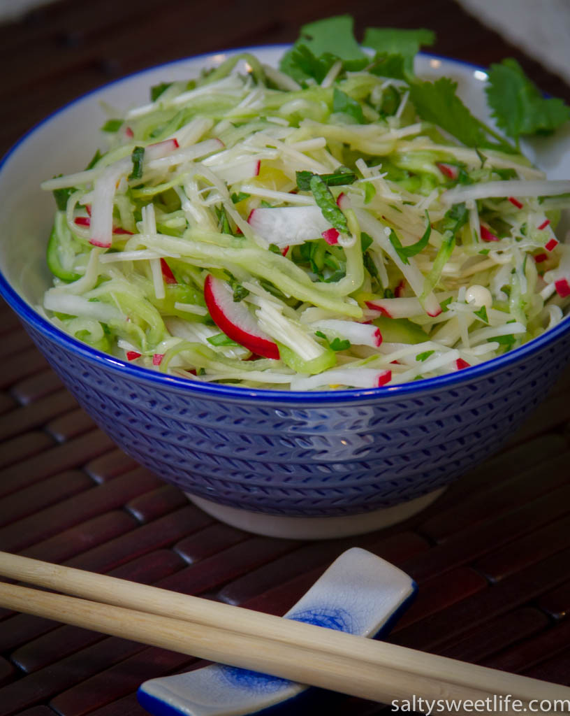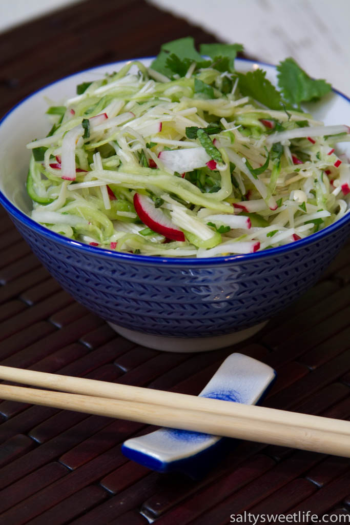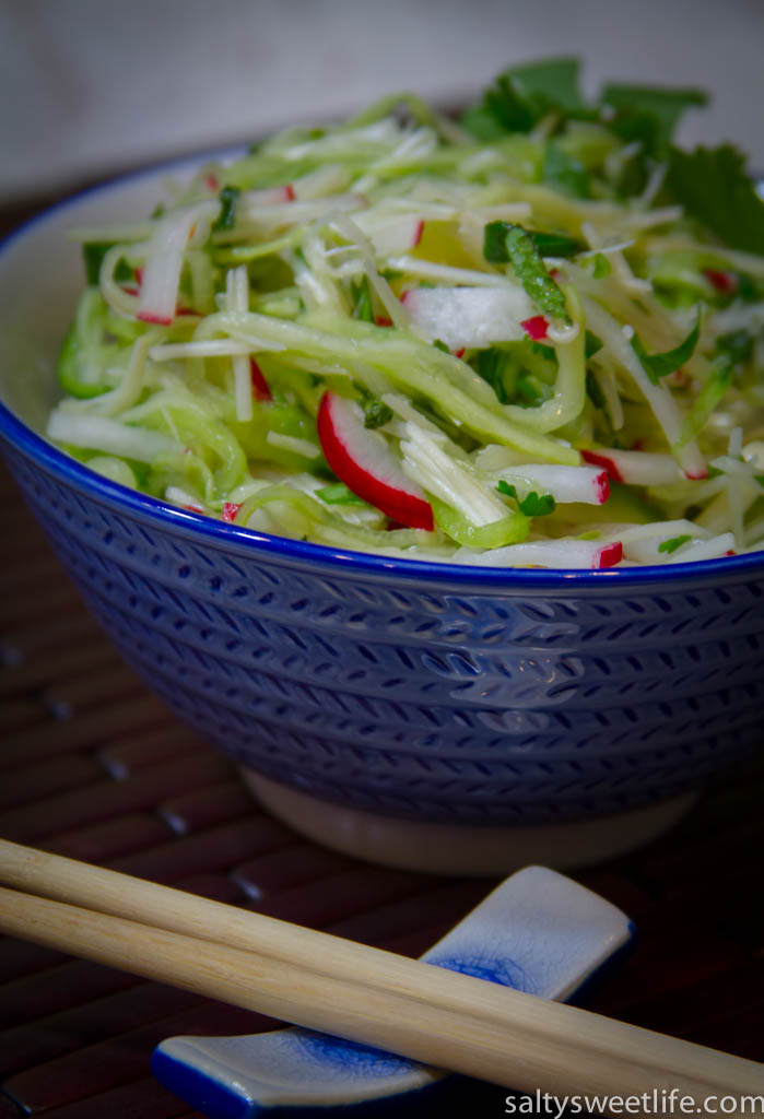 Preparing the salad is simple.  Having a julienne peeler makes preparing the cucumber easier, but it’s not necessary.  Simply peel the skin from the cucumber, scoop out the seeds with a spoon and slice the cucumber vertically into thin matchsticks.  If you don’t wish to be so fussy, you can slice it crosswise into half-moons.  For the radish, I sliced them into rounds using a mandoline, then sliced the rounds into matchsticks.  The dressing is equally simple and you can make adjustments as you like.  If you like a sweeter dressing, add additional sugar. If you like an extra kick of spice, add a bit of red chili flake!