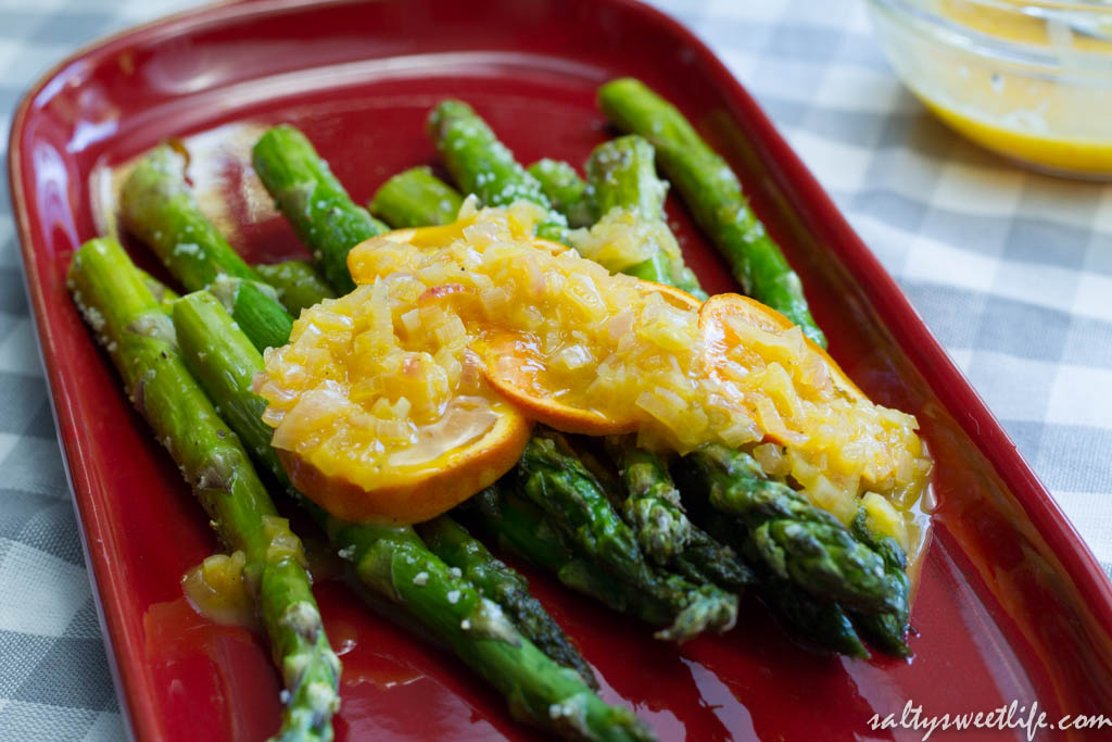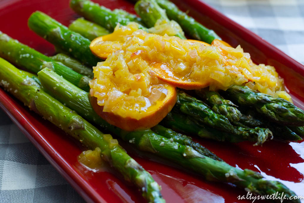 This week I want to share a few recipes that really celebrate the fresh flavors of Spring.  Easter is this weekend, and what I love about that holiday is that it’s the perfect opportunity to showcase bright, spring vegetables!  Even though I buy asparagus throughout the year, this is the time when they taste the best and don’t break the bank!  The recipe is so easy and I think it will be perfect on the Easter table. The asparagus is roasted in the oven and then finished with a sauce that is both bright and fresh as well as richly decadent.  This is yet another one of those sauces that I have to keep myself from eating with a spoon!