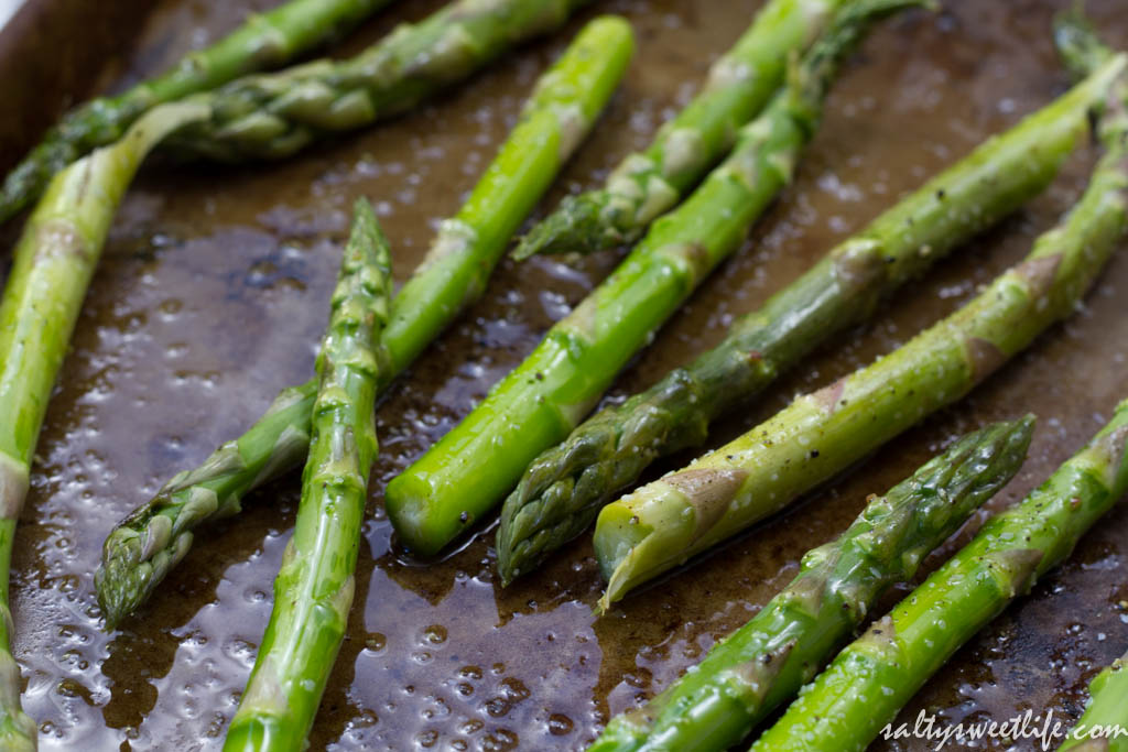 1. Rinse the asparagus and trim off the tough, woody ends. The easiest way to do this is to hold the asparagus stalk between the thumb and forefingers of both hands. Bend the stalk. The place where the stalk naturally breaks is the place where it’s tender. Spread the asparagus on a shallow baking pan and drizzle with olive oil. Season with salt and pepper. Roast in the oven for 20-25 minutes until the asparagus is tender, but not overcooked.