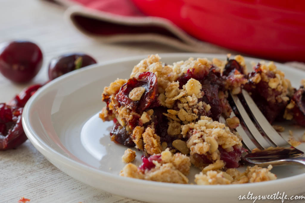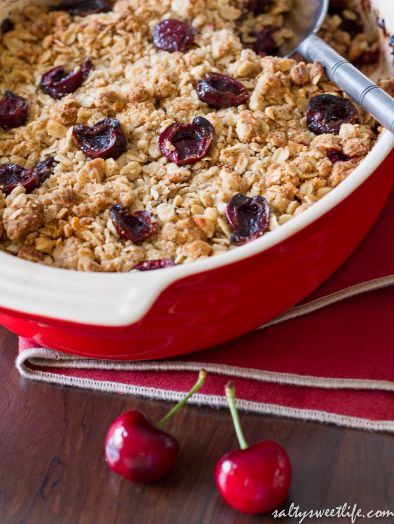 So with that, I’ll have to ask you for a pass on trying to describe this dish in a perfectly descriptive and fooderly manner, because it’s Just Not Going To Happen.  Not today at least.  So, without further ado:  You should make this crumble because cherries. And chocolate.   It is yum.