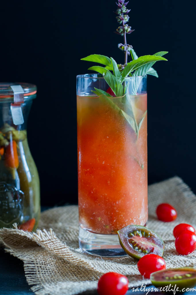Tomato Water Blood Mary - Salty Sweet Life I will be the first to admit that Bloody Marys have always been a bit of a mystery to me. Is it soup? Is it breakfast? Is it a non-pharmaceutical hangover cure? Aside from the Bloody Mary that one of my favorite restaurants in town makes (they serve them up spicy with a big piece of peppered bacon as a garnish), I’ve never really enjoyed them. If I’m really honest, that big piece of bacon is a major reason why I like that one! Until now, I was prepared to accept the fact that like the Negroni, the Bloody Mary would forever be a mystery to me. So, when I saw a recipe for a Tomato Water Bloody Mary in the pages of Food and Wine Magazine this month, first, I was intrigued and then a lightbulb went off in my head!   Since I’m already a chronic over-purchaser of certain items (in-season tomatoes, limes, and lemons, for example) and after last weekend’s baby shower, I ended up with an insane amount of leftover cocktail tomatoes! Added to that, we harvested what was left of our sad tomato crop from the garden. A word about that. This has been the most disappointing growing season ever! We planted more tomato plants this year than any other year and yet we harvested the least amount of tomatoes! Between an early heat wave,  a bunch of crazy windstorms, and a healthy dose of user error, our tomato plants looked like hell and they had to go.  So, we ripped out most of them and harvested what we managed to wrangle from the beaks of some very aggressive pigeons.  What we had left were some of the gnarliest, ugliest tomatoes I’d ever seen. Scarred, sun-scalded, split, unevenly red, you wouldn’t have wanted to run into these tomatoes in a dark alley; yet in a twist of irony, they were some of the juiciest and sweetest tomatoes I’d ever tasted! Tomato Water Bloody Mary - Salty Sweet Life So, while I pondered a way to use all these juicy and awesomely ugly tomatoes, I had another Eureka moment. Remember that hot pepper infused vodka that I made a while back?  Well, silly me left that hot pepper vodka to infuse for far too long and it was fire-breathing dragon hot!  It was so hot that the heat overpowered just about everything I tried it in.  I had a hunch that a Bloody Mary, with all its crazy, everything-but-the-kitchen-sink list of ingredients, would be the perfect vehicle to showcase such an in-your-face ingredient! So, with my armload of tomatoes, a bit of salt and a little patience, I whipped up this Bloody Mary and I’m proud to say that it’s the first one I’ve truly enjoyed!  It was bright; it was refreshing!  It didn’t taste like soup in a cup.  It had the perfect amount of lip-tingling heat, but it was balanced by that fresh, sweet, tomato water. I had to dilute my hot pepper vodka with plain vodka, but if your infusion isn’t too spicy, feel free to use all hot pepper vodka! As I mentioned, it does take a little patience to wait for all of those tomatoes to release enough water for the drink, but it is well worth it!  This is truly a great way to enjoy fresh, summer tomatoes, whether they are picture-perfect, or downright homely! And fear not, those tomatoes did not go to waste!  I threw them into the food processor with some onion, garlic and jalapeño peppers and made a mean bowl of salsa!
