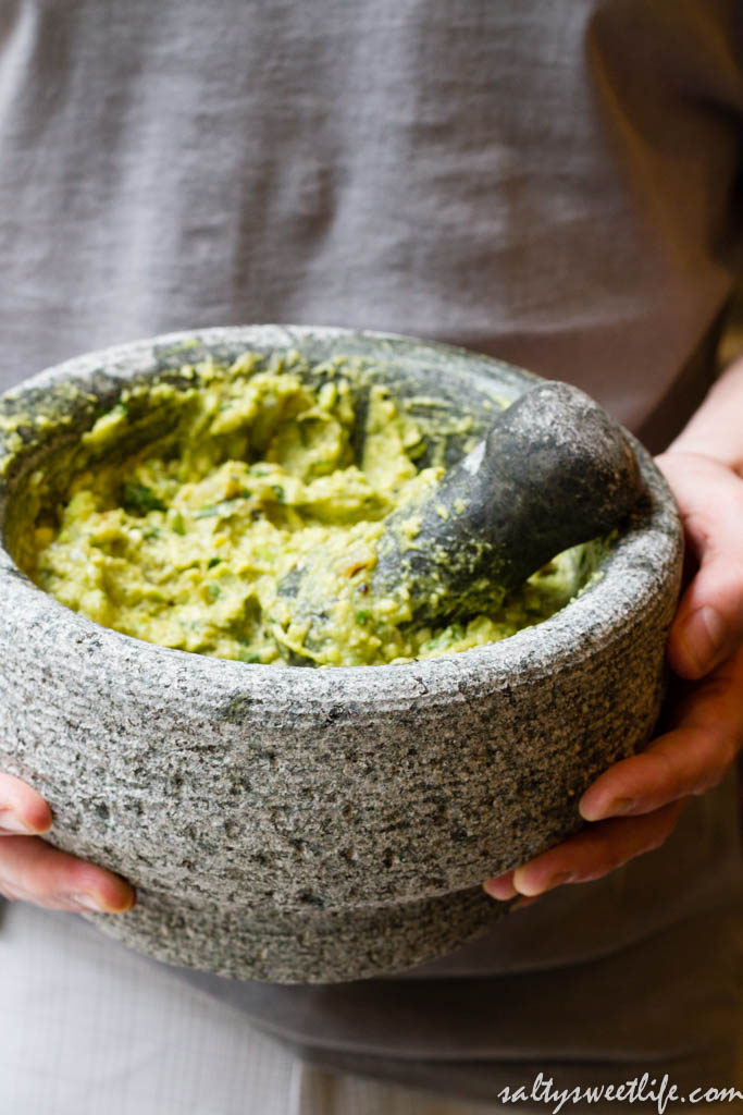 So let’s talk about this awesome molcajete I found! I almost hesitate to call it a true molcajete because it doesn’t have the characteristic three-footed base, so I’ll consider it a Modern Molcajete. How’s that for coinage? A traditional molcajete is basically a Mexican version of a mortar and pestle. I found this one at Costco recently for about $15.00 which is a steal! I have a much smaller mortar and pestle that easily set me back twice that price. At 8.5 inches in diameter and made of solid granite, it is almost the heaviest tool in my kitchen! I’d been seeing this molcajete at Costco for quite a few weeks and I hesitated buying it because, as I mentioned, I already had a mortar and pestle and I have a bit of an aversion to duplicating kitchen tools. But my smaller mortar and pestle made it challenging to make pesto because it was just too small and the basil kept flying out of it! So with the great price and at double the size, I just couldn’t pass it up! I’ll still use the smaller mortar and pestle as it is perfect for grinding whole spices.