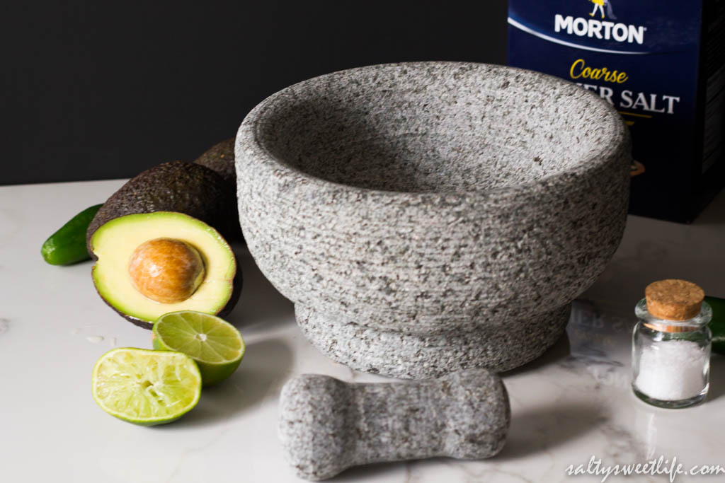 - Place all of the ingredients into the mortar and using a pounding and grinding motion, mix until the guacamole is semi-smooth and all of the ingredients are evenly distributed. Taste and add additional lime juice or salt if needed. Alternatively, if not using a mortar and pestle or molcajete, mash all of the ingredients together with a fork or potato masher.