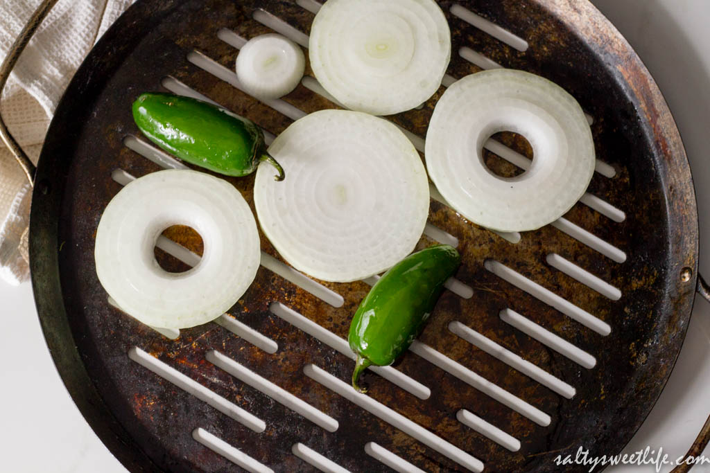 - Slice 1/2 of a large onion into thick slices. Coat the onion, jalapeños and garlic cloves with oil and place them on baking sheet or cast iron grill pan and grill until the onion is softened and lightly charred, about 10 minutes. With tongs, toss the onions often so that they don’t burn and rotate the jalapeños until their skin becomes evenly charred. Remove from the heat and allow to cool.